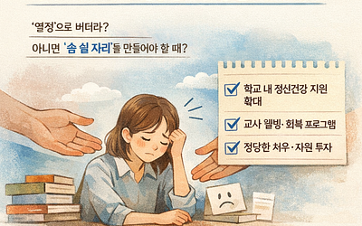 “교사 정신건강”을 중심에 두지 않으면, 교실은 오래 버티기 힘들다 교사 부족은 “사람이 없어서”만 생기지 않습니다. 누군가가 교실로 들어오더라도, 버티기 어려운 구조라면 ...